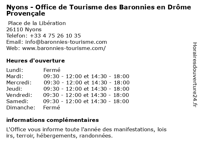 Termes de recherche pour Nyons - Office de Tourisme des Baronnies en Drôme Provençale:en, provence, de, des, vacances, office, tourisme, drôme, information, provencale, baronnies, nyons, documentation, visite, manifestation |