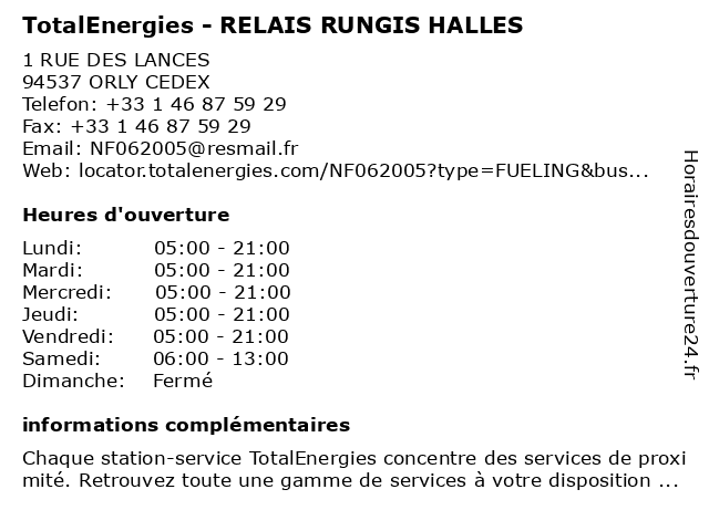 Termes de recherche pour TotalEnergies - RELAIS RUNGIS HALLES:relais, halles, total, rungis, gas station, station service, tankstelle, totalenergies |
