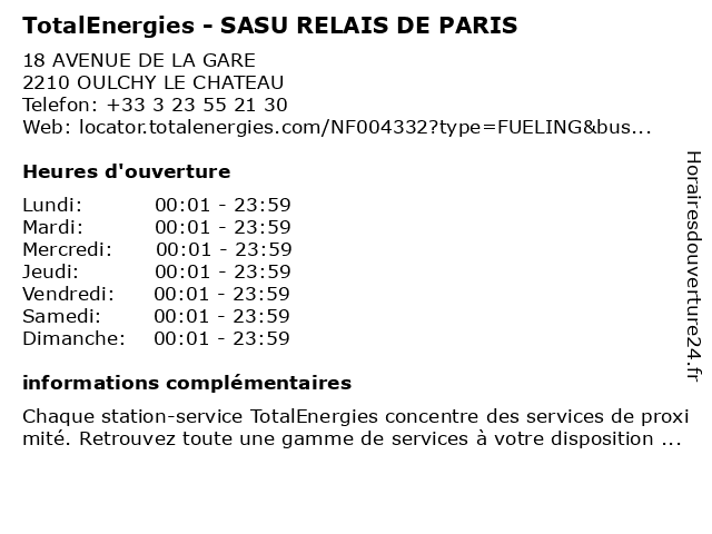 Termes de recherche pour TotalEnergies - SASU RELAIS DE PARIS:relais, de, paris, total, sasu, gas station, station service, tankstelle, totalenergies |