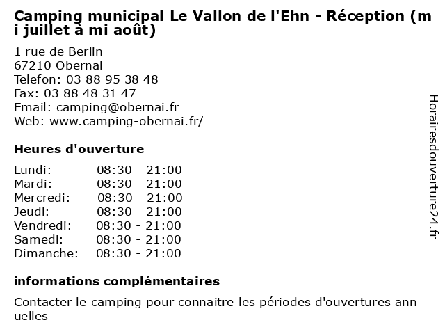 1 Camping municipal Le Vallon de l'Ehn - Réception (Mai, jusqu'au 15 juillet et de mi-août à fin août) (Distance: 0,00 km) 1 rue de Berlin, 67210 Obernai 15, août, camping, de, et, fin, hebergement, juillet, jusqu'au, l'ehn, le, mai, mi, municipal, réception, tourisme, vallon 2 AXA Prévoyance & Patrimoine Romuald Mi Poudou (Distance: 1,51 km) 13 Rue du Général Leclerc, 67210 Obernai assurance décès, assurance entreprise, assurance epargne, assurance invalidité, assurance patrimoine, assurance profession libérale, assurance protection juridique, assurance prévoyance, assurance santé, assurance vie, axa, mi, patrimoine, poudou, prévoyance, romuald 3 Hotel Gîte A Mi Chemin (Distance: 1,99 km) 27 Rue du Maréchal Koenig, 67210 Obernai bar, chemin, gîte, hotel, mi, restaurant, service 4 Le Jardin du Cloître - du 1er juillet au 31 août (Distance: 8,12 km) 1 Place Saint Cyriaque, 67120 Altorf 1er, 31, août, au, cloître, du, jardin, jardins, juillet, le, patrimoine, tourisme 5 Piscine intercommunale de plein air - du 1er juillet au 3 septembre (Distance: 8,94 km) - Rue des Sports, 67120 Molsheim 1er, air, au, de, du, intercommunale, juillet, loisirs, piscine, plein, septembre 6 |