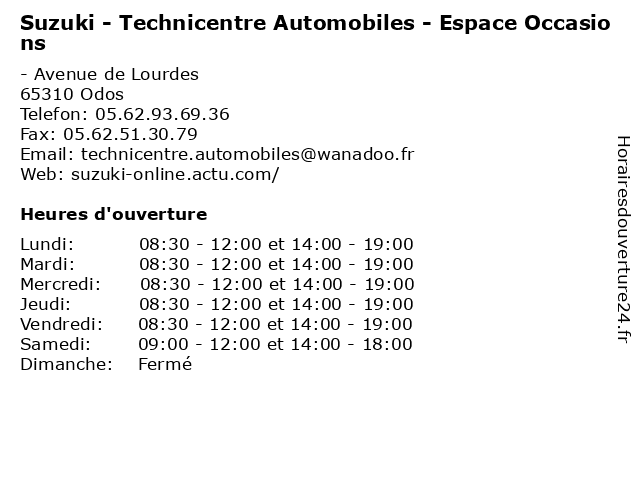 1 Suzuki - Technicentre Automobiles - Espace Commercial (Distance: 0,00 km) - Avenue de Lourdes, 65310 Odos automobiles, commercial, espace, révisions, service, services, services d'automobiles, suzuki, technicentre 2 Suzuki - Technicentre Automobiles - Service Après-Vente (Distance: 0,00 km) - Avenue de Lourdes, 65310 Odos après, automobiles, révisions, service, services, services d'automobiles, suzuki, technicentre, vente 3 Suzuki - Technicentre Automobiles - Magasin (Distance: 0,00 km) - Avenue de Lourdes, 65310 Odos automobiles, magasin, révisions, service, services, services d'automobiles, suzuki, technicentre 4 Technicentre Automobiles (Distance: 1,26 km) 88 Route de Lourdes, 65310 Odos accessoires, après-vente, automobiles, contrôle technique, pièces de rechange, technicentre, véhicules d'occasion, véhicules neufs 5 Agence Matrimoniale - Espace Unicis S.A. (Distance: 2,28 km) 9 rue de l'Harmonie, 65000 Tarbes agence, espace, matrimoniale, s.a., unicis 6 E.Leclerc Espace Culturel (Distance: 4,28 km) Route de pau, 65420 Ibos culturel, e.leclerc, espace, fournisseur de matériel audiovisuel, librairies, magasin de jeux vidéo, magasin de musique, matériel de photographie, matériel vidéo, services et matériel vidéo |