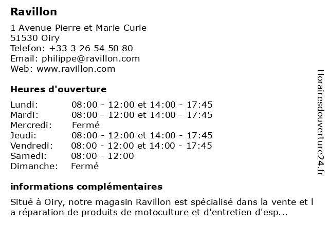 2 Ravillon (Distance: 11,75 km) 80 Avenue de Bammental, 51130 Blancs-Coteaux espaces verts, micro-tracteurs, motoculture, ravillon, tondeuses 4 Collard & Fils (Distance: 6,86 km) . Avenue Thévenet, 51530 Magenta bricolage, collard, fils, jardinage, materiel, motoculture, réparation 5 Collard & Fils - Motoculture (Distance: 27,78 km) . ZAC de Thillois, 51370 Thillois bricolage, collard, fils, jardinage, materiel, motoculture, réparation 6 Collard & Fils Motoculture (Distance: 27,88 km) 2 Rue Louis Leprince Ringuet, 51000 Châlons-en-Champagne bricolage, collard, fils, jardinage, materiel, motoculture, réparation |