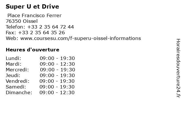 5 Super U et Drive (Distance: 15,54 km) Centre Commercial Cailly 2000 Rue des Martyrs de la Résistance, 76150 Maromme drive, et, super 6 Carrefour Drive (Distance: 1,97 km) 2 Avenue Gustave Picard, 76410 Tourville la Rivière carrefour, drive, hypermarche, marche, market |