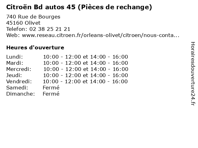 1 Citroën Bd Autos 45 (Horaires Généraux) (Distance: 0,00 km) 740 Rue de Bourges, 45160 Olivet 45, autos, bd, citroën, generaux, généraux, horaires, services, véhicules 2 Citroën Bd Autos 45 (Véhicule Neuf/d'Occasion - Après Vente) (Distance: 0,00 km) 740 Rue de Bourges, 45160 Olivet 45, après, autos, bd, citroën, neuf/d'occasion, services, vehicule, vente, véhicule, véhicules 4 Sos Gsm 45 (Distance: 6,11 km) 3 Rue du Cheval Rouge, 45000 Orléans 45, gsm, magasin de téléphonie cellulaire, ordinateurs, service de réparation, sos, téléphones cellulaires. 5 Pièces Auto 45 (Distance: 8,10 km) 13 rue de la Mouchetière, 45140 Saint-Jean-de-la-Ruelle 45, auto, autos, car, embrayage, essuyage, nouvelle, pieces, pièces, pneumatiques, vente, vitrage, voiture 6 Dépan'Micro - Dms 45 (Distance: 11,53 km) 159 Rue de la Borde, 45240 Marcilly-en-Villette 45, dms, dépan'micro, informatique, logiciel, ordinateur, réseau |