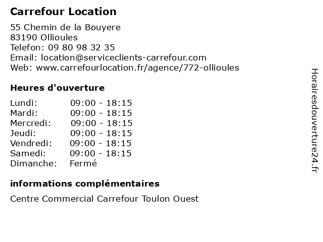 1 Carrefour Location (Distance: 4,94 km) - avenue de la Mer, 83140 Six Fours les Plages alimentation, carrefour, location, magasin discount, market, supermarché 2 Carrefour Location (Distance: 6,21 km) 49 Avenue Du General Pruneau, 83200 Toulon agence, carrefour, location, utilitaires, véhicules 3 Carrefour Location (Distance: 11,13 km) - Avenue de l'Université, 83160 La Valette-du-Var carrefour, location, services, utilitaires, vehicules 4 Carrefour Location (Distance: 11,59 km) . quartier de la Guarduère, 83150 Bandol carrefour, location, trajet, utilitaire, véhicule 5 Carrefour Location (Distance: 18,00 km) - ZI Le Patrimoine, 83260 La Crau agence, carrefour, location, utilitaires, véhicules 6 Carrefour Voyages (Distance: 0,18 km) 55 chemin de la Bouyère, 83190 Ollioules agences, carrefour, location, vacances, voyages |