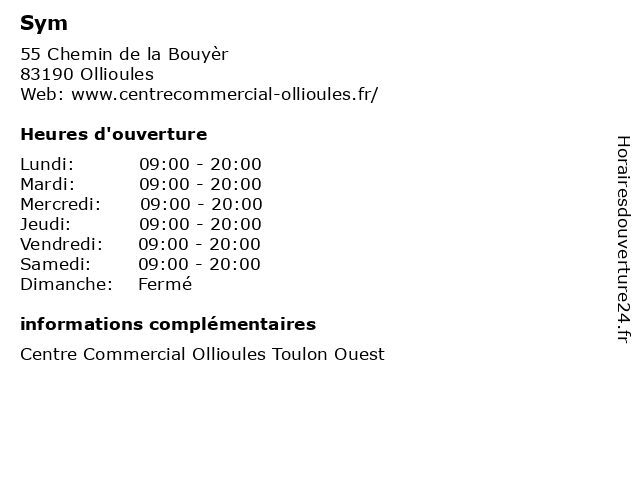 1 Sym (Distance: 0,04 km) 55 Chemin de la bouyère, 83190 Ollioules accessoires, habillement, mode, pret à porter, sym, vetements 2 Sym (Distance: 4,18 km) . Toulon Ouest, 83190 Ollioules cafe, chaussures, enfants, homme, lingerie, mode femme, restaurant, sym 4 Mac Sym s (Distance: 6,15 km) 10 Quai Du Gal Charles De Gaulle, 83110 Sanary Sur Mer burger, hollywood, mac, restaurants, sym 5 Paul (Distance: 0,00 km) 55 Chemin de la Bouyère, 83190 Ollioules centre, commercial, ollioules, ouest, paul, toulon 6 Douglas (Distance: 0,00 km) 55 Chemin de la Bouyère, 83190 Ollioules centre, commercial, douglas, ollioules, ouest, toulon |