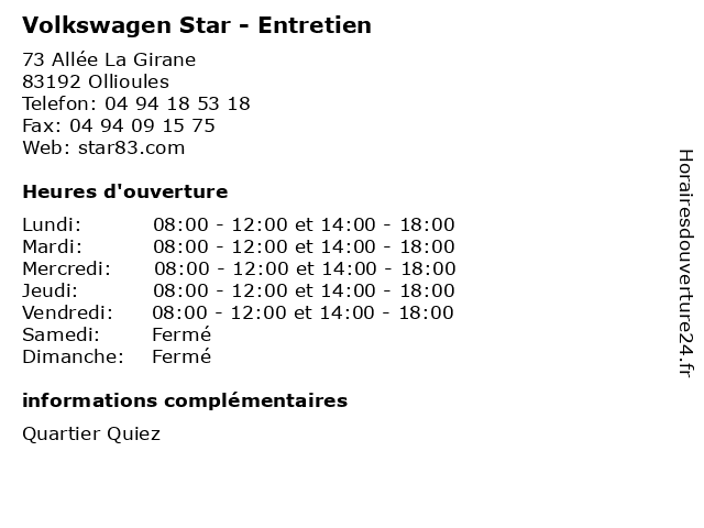 1 Volkswagen Star - Rent (Distance: 0,00 km) 73 Allée la Girane, 83190 Ollioules automobiles, concessionnaire, d’origine, garage, location, motos, pièces, rent, star, vente, volkswagen 2 Volkswagen Star - Hybride (Distance: 0,00 km) 73 Allée La Girane, 83190 Ollioules atelier, automobile, concessionnaire, garage, hybride, neuve, occasion, réparation, star, vente, volkswagen 3 Volkswagen Star - Véhicule neuf et occasion (Distance: 0,00 km) 73 Allée La Girane, 83190 Ollioules activités, automobiles, concessionnaire, d’occasion, et, garage, motos, neuf, occasion, star, volkswagen, véhicule, véhicules 4 AAA ENTRETIEN (Distance: 0,86 km) 42 Impasse des Platanes, 83200 Toulon aaa, abattage, création de clôtures, création de jardin, création de terrasse en bois, entretien, entretien de jardin, jardinier paysagiste dans le var, terrassement, élagage 5 Star Burger Livraison (Distance: 2,30 km) 44 Bd Du General Brosset, 83200 Toulon burger, livraison, restaurants, star 6 Services Rénovation Entretien (Distance: 2,87 km) 129 Rue Gorlier, 83200 Toulon entretien, rénovation, services |