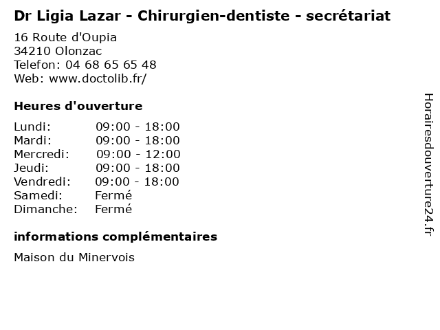 1 Dr Ligia Lazar - Chirurgien-dentiste - secrétariat (Distance: 0,00 km) 16 Route d'Oupia, 34210 Olonzac chirurgien, consultation, dentiste, docteur, dr, lazar, ligia, med, secrétariat 2 Medecin Frederic Vavdin (Chirurgien général) (Distance: 37,48 km) . Route de Bram, 11890 Carcassonne chirurgien, docteur, frederic, général, medecin, sante, services, vavdin 3 Medecin Frederic Vavdin - Horaires Cabinet (Chirurgien général) (Distance: 37,48 km) . Route de Bram, 11890 Carcassonne cabinet, chirurgien, docteur, frederic, général, horaires, medecin, sante, services, vavdin 4 Medecin Gerald Le Bartz (Chirurgien viscéral) (Distance: 37,48 km) . Route de Bram, 11000 Carcassonne bartz, chirurgien, docteur, gerald, le, medecin, sante, services, viscéral 5 Medecin Patrick Buenos (Chirurgien viscéral) (Distance: 39,84 km) 32 Avenue Enseigne Albertini, 34500 Beziers buenos, chirurgien, docteur, medecin, patrick, sante, services, viscéral 6 Medecin Arnaud Largey (Chirurgien orthopédiste et traumatologue) (Distance: 40,47 km) 62 Avenue Jean Moulin, 34500 Beziers arnaud, chirurgien, docteur, et, largey, medecin, orthopédiste, sante, services, traumatologue |