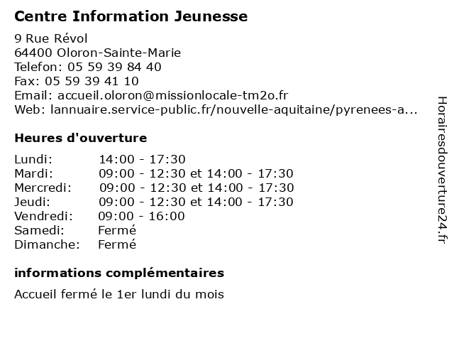 1 Centre d'Information et d'Orientation (CIO) (Distance: 0,00 km) 9 Rue Révol, 64400 Oloron-Sainte-Marie administration, assoc, centre, cio, d'information, d'orientation, et, services, services publics 2 Point d'information local dédié aux personnes âgées (Distance: 0,14 km) 14 rue Adoue, 64400 Oloron Sainte-Marie administration, assoc, associations, aux, d'information, des, dédié, greffe, local, locale, mission, personnes, point, services, services publics, âgées 3 Point Information Jeunesse (Distance: 18,39 km) 4 Rue du Général Pommiès, 64230 ARBUS administration, assoc, information, jeunesse, point, services, services publics 4 Point Information Jeunesse (Distance: 19,57 km) . Avenue de Monein, 64150 Mourenx administration, assoc, information, jeunesse, point, services, services publics 5 Point Information Jeunesse (Distance: 21,34 km) 41 rue Principale, 64230 POEY DE LESCAR administration, assoc, information, jeunesse, point, services, services publics 6 Point Information Jeunesse (Distance: 21,65 km) . Rue Raoul Follereau, 64230 LESCAR administration, assoc, information, jeunesse, point, services, services publics |