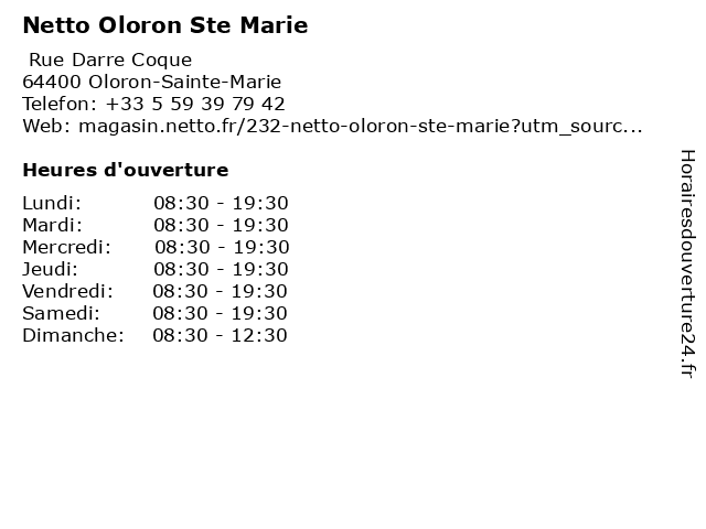 1 Netto Oloron Ste Marie (Distance: 0,01 km) Rue Frédéric Ariès, 64400 Oloron-Sainte-Marie marie, netto, oloron, ste 3 Piscine à Oloron Ste Marie (Bassin intérieur - Période scolaire) (Distance: 0,55 km) - boulevard Mitterand, 64400 Oloron-Sainte-Marie bassin, intérieur, marie, natation sportive, oloron, piscine, période, scolaire, sportif, ste 4 Piscine à Oloron Ste Marie (Bassin intérieur - Vacances scolaires (hors vacances d'été) ) (Distance: 0,55 km) - boulevard Mitterand, 64400 Oloron-Sainte-Marie bassin, d'été, hors, intérieur, marie, natation sportive, oloron, piscine, scolaires, sportif, ste, vacances 5 Piscine à Oloron Ste Marie (Bassin intérieur - Vacances d'été) (Distance: 0,55 km) - boulevard Mitterand, 64400 Oloron-Sainte-Marie bassin, d'été, intérieur, marie, natation sportive, oloron, piscine, sportif, ste, vacances 6 Piscine à Oloron Ste Marie (Bassin intérieur - 14 Juillet et 15 Août) (Distance: 0,55 km) - boulevard Mitterand, 64400 Oloron-Sainte-Marie 14, 15, août, bassin, et, intérieur, juillet, marie, natation sportive, oloron, piscine, sportif, ste |