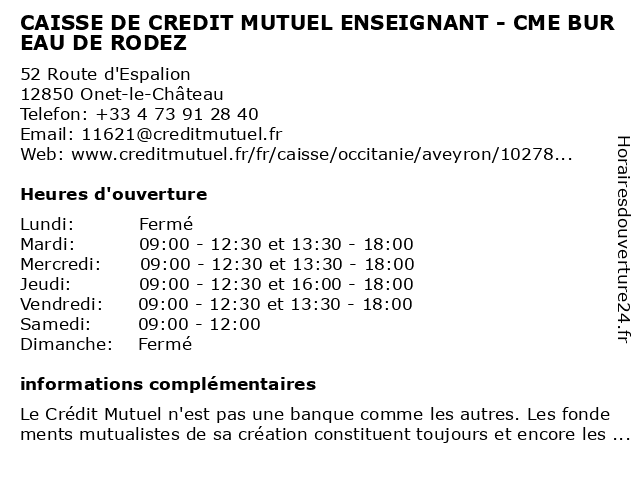 Termes de recherche pour CAISSE DE CREDIT MUTUEL ENSEIGNANT - CME BUREAU DE RODEZ:de, rodez, bureau, crédit, mutuel, caisse, cme, enseignant |