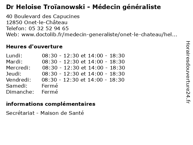 | Lundi | 08:30-12:30 et 14:00-18:30 |