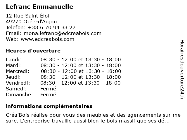 | Mercredi | 08:30-12:00 et 13:30-18:00 |