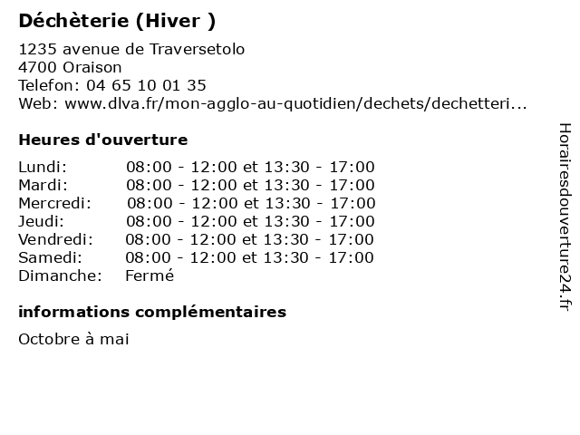 1 Déchèterie (Été) (Distance: 0,00 km) 1235 avenue de Traversetolo, 04700 Oraison bennes, collecte, déchets, déchèterie, gravats, tri, été 2 Déchèterie (Été) (Distance: 3,81 km) - lieu-dit Les Iscles, 04180 Villeneuve bennes, collecte, déchets, déchèterie, gravats, tri, été 3 Déchèterie (Hiver) (Distance: 3,81 km) - lieu-dit Les Iscles, 04180 Villeneuve bennes, collecte, déchets, déchèterie, détritus, gravats, hiver, tri 4 Déchèterie (Hiver) (Distance: 7,80 km) - ancienne Voie Ferrée, 04300 Pierrerue bennes, débarras, déchèterie, détritus, hiver, mars, novembre, ordures, poubelles 5 Déchèterie (Eté) (Distance: 7,80 km) - ancienne Voie Ferrée, 04300 Pierrerue avril, bennes, débarras, déchèterie, détritus, eté, octobre, ordures, poubelles 6 Déchèterie (Distance: 9,32 km) - de Dauphin, 04300 Dauphin déchèterie, gravats, huiles usées, la réception des déchets et écocentres, les appareils électroménagers, les déchets verts, papier et carton en quantité |
