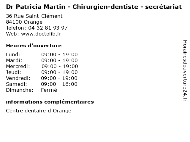 1 AXA Assurance et Banque Klelifa Martin Sylla (Distance: 0,18 km) 13 Cours Aristide Briand, 84100 Orange assurance, assurance appartement, assurance auto, assurance entreprise, assurance epargne, assurance habitation, assurance maison, assurance professionnelle, assurance santé, assurance voiture, axa, banque, et, klelifa, martin, sylla 2 Lissac l'Opticien Orange, Saint Martin (Distance: 0,35 km) 7 Rue Saint-Martin, 84100 Orange l'opticien, lentilles de contact, lissac, lunettes de soleil, lunettes de vue, martin, opticien, opticien lissac, orange, saint 3 Christine Martin - Psychologue (Distance: 0,76 km) 14 Avenue Henri Fabre, 84100 Orange christine, martin, psy, psychiatre, psychologue, sante, soins 5 Madame Béatrice Martin - Endocrinologie (secrétariat ) (Distance: 12,06 km) - louis pasteur, 30200 Bagnols Sur Ceze, béatrice, consultation, docteur, endocrinologie, madame, martin, santé, secrétariat 6 Dr Patricia Riou - Médecin généraliste (Distance: 15,43 km) 125 Rue de la Coquille, 84700 Sorgues consultation, docteur, dr, généraliste, med, médecin, médecine, patricia, riou, secrétariat, traitement |