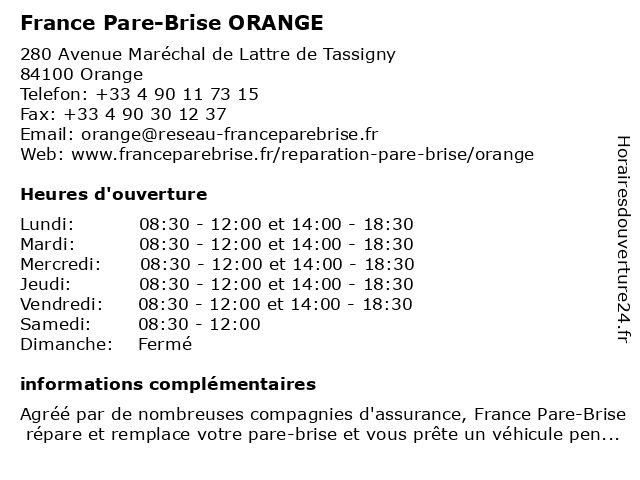 1 France Pare Brise (Distance: 0,02 km) 280 Avenue De Lattre De Tassigny, 84100 Orange bris de glace, brise, france, pare, services 3 Mondial Pare-Brise - Point Relais (Distance: 4,05 km) 221 Avenue de l'Europe, 84100 Orange brise, mondial, pare, point, relais 5 Mondial Pare-Brise (Distance: 15,14 km) 435 Route de Lyon, 30200 Bagnols-sur-Cèze brise, mondial, pare 6 Rapid Pare-Brise (Distance: 15,26 km) 897 Avenue Alphonse Daudet, 30200 Bagnols-sur-Cèze auto, bris de glace, brise, centre, pare, pare brise, rapid, réparation  |