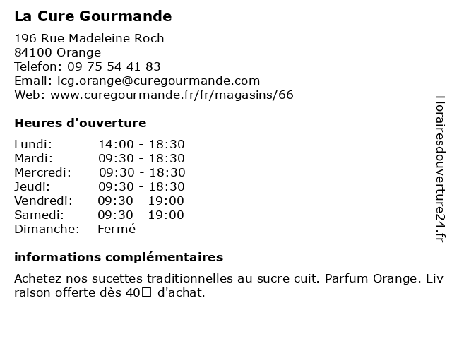 1 Restaurant Table Gourmande Le Mogador (Distance: 12,32 km) Route De Vaison La Romaine, 84150 Violes chateau, gourmande, le, martinet, mogador, restaurant, restaurants, table 2 Maison de La Presse (Distance: 0,15 km) 40 Rue Caristie -, 84100 Orange cadeaux, carterie, confiserie-boissons-food, de, française des jeux, la, librairie, maison, papeterie, pmu, presse, tabac 3 Pâtisserie Cabanis Alain (Distance: 0,26 km) 37 rue Saint Martin, 84100 Orange alain, cabanis, chocolat, chocolaterie, patisserie, patissier, pâtisserie 4 Leonidas (Distance: 18,98 km) . Route de Carpentras, 84130 Le Pontet chocolat, confiserie, leonidas, pralines 5 Cure Gourmande (Distance: 20,86 km) 28 Place du Change, 84000 Avignon biscuits, caramels, chocolat, cure, gourmande 6 Columbus Café & Co (Distance: 20,88 km) 16 place Pie, 84000 Avignon bar, boissons, café, cafés, chaudes, chocolat, co, coffee-shop, columbus, expressos, muffins, restaurant, restauration, sandwichs, thé  |