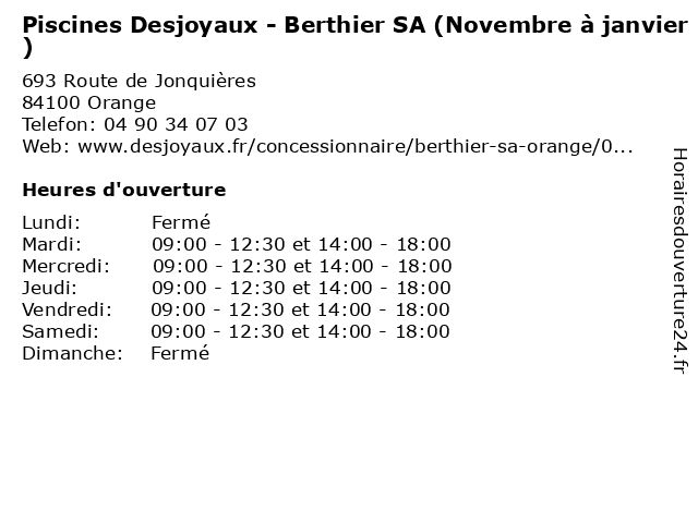 1 Piscines Desjoyaux - Berthier SA (novembre à janvier) (Distance: 15,32 km) - Route de Carpentras, 84700 Sorgues berthier, de, desjoyaux, fitness, janvier, musculation, novembre, piscines, sa, salle, sport 2 Piscines Desjoyaux Orange (Distance: 0,43 km) 200 Route d'Avignon, 84100 Orange desjoyaux, orange, piscines 3 Aquilus Piscines et Spas Orange (Distance: 0,57 km) 104 Route de Jonquières, 84100 Orange aquilus, et, orange, piscines, spas 5 Abolone Piscines (Distance: 1,32 km) . Rue Cinsault, 84100 Orange abolone, cafe, chaussures, enfants, homme, mode femme, piscines, restaurant, service, sport 6 Théâtre Antique (Janvier, février, novembre, décembre) (Distance: 2,51 km) - Rue Madeleine Roch, 84100 Orange ancien, antique, art, décembre, exposition, février, histoire, janvier, livre, monument, musée, novembre, savoir, théâtre |