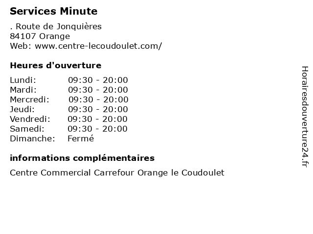 1 Services Minute (Distance: 1,06 km) . Route De Jonquières, 84107 Orange carrefour, centre, commercial, coudoulet, le, minute, orange, services 2 Services Minute (Distance: 4,95 km) . Route de Jonquières, 84107 Orange cafe, chaussures, enfants, homme, lingerie, minute, mode femme, restaurant, services, sport 4 Body Minute (Distance: 19,36 km) 23 Rue Carnot, 84000 Avignon beauté, body, cheveux, corps, minute, ongles, soins 5 Brasserie Le Karisse (Distance: 0,00 km) . Route de Jonquières, 84107 Orange beaute, brasserie, cafe, charline, chaussures, enfants, hommes, karisse, le, lingerie, mode femmes, restaurant, sport 6 Brice (Distance: 0,00 km) . Route de Jonquières, 84107 Orange beaute, brice, cafe, charline, chaussures, enfants, hommes, lingerie, mode femmes, restaurant, sport |