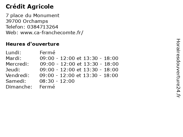 1 Crédit Agricole (Distance: 0,03 km) 7 Place Du Monument, 39700 Orchamps agence, agricole, assurance, bancaire, banque, crédit 2 Crédit Agricole (Distance: 12,30 km) . place de la mairie, 70140 Pesmes agricole, ca, crédit, crédit agricole 3 Crédit Agricole (Distance: 13,33 km) - Zac des Belles Ouvrières, 25410 Saint-Vit agence, agricole, assurance, bancaire, banque, crédit 4 Crédit Agricole (Distance: 15,90 km) 2 Rue du centre Bourg, 25610 Arc-et-Senans agence, agricole, assurance, bancaire, banque, crédit 5 Crédit Agricole Franche-Comté (Distance: 6,28 km) 3 Rue de Besançon, 39700 Dampierre agence, agricole, assurance, bancaire, banque, comté, crédit, franche 6 Crédit Agricole Franche-Comté (Distance: 13,69 km) 4 Rue de Besançon, 39100 Dole agence, agricole, assurance, bancaire, banque, comté, crédit, franche |