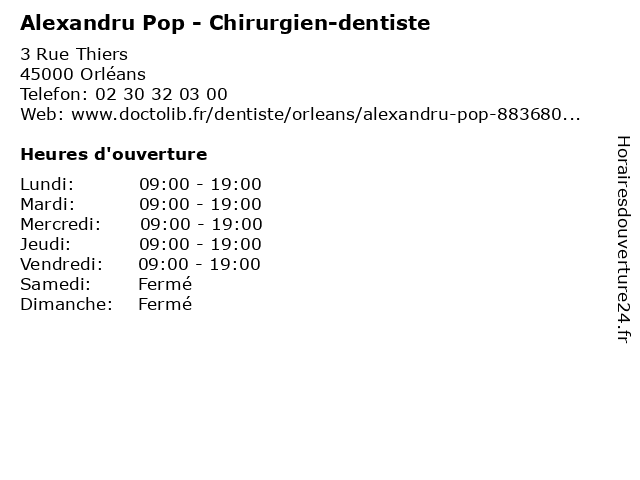 1 La Java Pop (Distance: 0,48 km) 45 Rue de la Charpenterie, 45000 Orléans arts, bar, cocktails, divertissement, java, la, orleans, pop, spectacle 2 Dr Alexandru Milea - Ophtalmologue (Distance: 1,10 km) 11 Avenue Jean Zay, 45000 Orléans alexandru, dr, milea, oeuil, ophtalmologue, sante, vision 3 Méga FM (Distance: 23,90 km) 7 Impasse Maupin, 45110 Châteauneuf-sur-Loire fm, loir-et-cher, loiret, musique, méga, pop, radio, rock 4 Dr Alexandru Doran - Chirurgien-dentiste - secrétariat (Distance: 52,99 km) 7 Rue Alfred de Vigny, 41350 Vineuil alexandru, chirurgien, consultation, dentiste, docteur, doran, dr, med, secrétariat 5 BalnéoSpa (Distance: 0,05 km) 54 Place du Chatelet, 45000 Orléans balnéospa, beauté, bien-être, hammam, institut balnéospa, loiret, massage, minceur, orléans, rituels spa, soins duo 6 Marionnaud (Distance: 0,07 km) 320 Rue de Bourgogne, 45000 Orléans beauté, cosmétique, crèmes, esthétique, huiles, maquillage, marionnaud, parfumerie, parfums, soins |