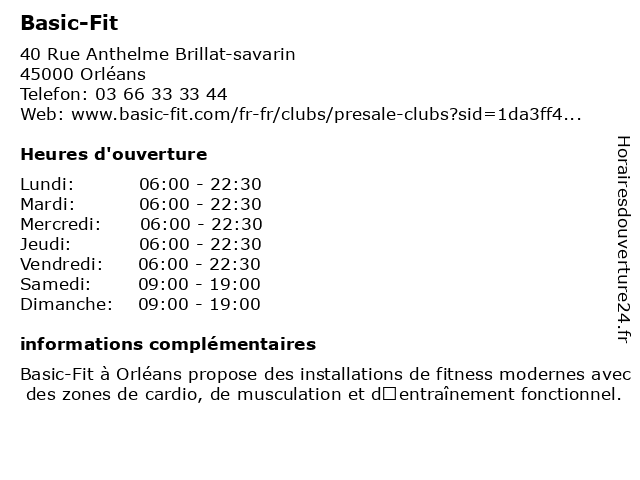 3 Planet Fit (Distance: 0,57 km) 27 Rue Basse Mouillère, 45100 Orléans exercices, fit, fitness, gym, planet, sports 6 Basic Fit (Distance: 5,11 km) - Avenue Pierre Mendès France, 45140 St Jean de la Ruelle basic, fit, fitness, forme, musculation, salle, sport |
