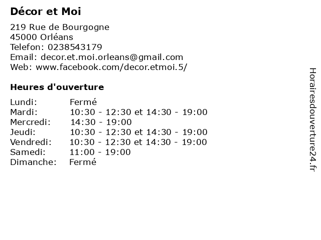 1 Chef et Moi (Distance: 0,18 km) 10 Rue des Halles, 45000 Orleans chef, cuisine, et, moi, restaurant, restauration 2 Des Habits Et Moi (Distance: 0,43 km) 4 Rue du Cheval Rouge, 45000 Orléans accessoires, boutique, des, et, habits, mode, moi, vêtements 3 BCL Décor - Espace Showroom (Distance: 1,32 km) 8 Rue du Faubourg Madeleine, 45000 Orléans bcl, de, décor, economie.couleurs, espace, peinture, sala, showroom, ventas 4 Autissier Décor et Bain (Distance: 4,27 km) 652 rue Marcel Belot, 45160 Olivet autissier, bain, décor, et 5 ALM Renov Et Décor (Distance: 4,98 km) 70 Rue de la Fosse aux Cures, 45400 Semoy alm, décor, et, renov 6 Genevieve Lethu (Distance: 0,37 km) 41 Rue Royale, 45000 Orleans ameublement, genevieve, lethu, magasins, rocadeco |