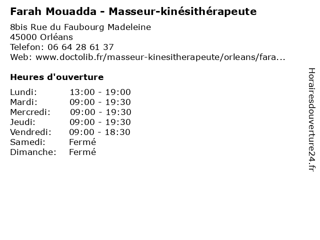 1 Maître Farah Lakbiri - Avocate (Distance: 2,88 km) 74 Bis rue de l’Argonne, 45000 Orleans avocat, avocate, droit, farah, farah lakbiri, juridictionnelle, lakbiri, maître, négociation 2 Adrien Bedu - Masseur-kinésithérapeute (Distance: 0,38 km) 17 Rue Porte Saint-Jean, 45000 Orléans adrien, bedu, docteur, kine, kinesitherapeute, kinésithérapeute, masseur 3 Julie Marchese - Masseur-kinésithérapeute (Distance: 1,49 km) 5 Rue des Sansonnières, 45000 Orléans docteur, julie, kine, kinesitherapeute, kinésithérapeute, marchese, masseur 4 Sabrina Brasseur - Masseur-kinésithérapeute (Distance: 2,02 km) 146 Rue des Murlins, 45000 Orléans brasseur, docteur, kine, kinesitherapeute, kinésithérapeute, masseur, sabrina 5 Hugo Perron - Masseur-kinésithérapeute (Distance: 5,49 km) 275 Rue de Pounelle, 45160 Olivet docteur, hugo, kine, kinesitherapeute, kinésithérapeute, masseur, perron 6 Antoine Segault - Masseur-kinésithérapeute (Distance: 6,44 km) 139 Allée de la Monesse, 45160 Saint-Hilaire-Saint-Mesmin antoine, docteur, kine, kinesitherapeute, kinésithérapeute, masseur, segault |