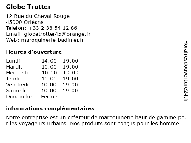 1 Maroquinerie Badinier Globe trotter (Distance: 0,08 km) 48 Rue Royale, 45000 Orléans badinier, globe, maroquinerie, trotter 2 BDB Globe Débarras (Distance: 36,70 km) 5 Rue Jules César, 45340 Nancray-sur-Rimarde bdb, débarras, globe |
