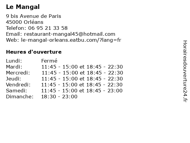 | Mardi | 11:45-15:00 et 18:45-22:30 |