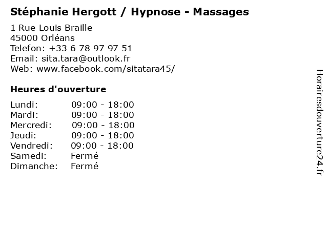 1 Jocelyne Massages (Distance: 0,03 km) 9 Rue du Maréchal Leclerc, 45000 Orléans beauté, jocelyne, massage, massages, relax, salon, spa 2 Catherine Marie Leroy - Massages (Distance: 0,65 km) 1 Rue de la Bourie Blanche, 45000 Orléans beauté, catherine, leroy, marie, massage, massages, relax, salon, sante 3 Stéphanie Lemaire - Sage-femme (Distance: 2,04 km) 1 Rue Porte Madeleine, 45100 Orleans consultation, docteur, dr, femme, lemaire, med, médecin, sage, stephanie, stéphanie, traitement 4 Stéphanie Greuin - Hypnothérapeute (Distance: 2,29 km) 84 Rue la Barrière Saint-Marc, 45000 Orléans greuin, hypno, hypnose, hypnothérapeute, sante, stephanie, stéphanie 5 Stéphanie Givelet - Sage-femme - secretariat (Distance: 3,77 km) 3 Bis Rue Honoré d'Estienne d'Orves,, 45100 Orléans femme, givelet, médecin, médecine, médical, pharmaceutique, sage, secretariat, stéphanie, traitement 6 Jocelyne Massages Bien-être (Distance: 6,29 km) 3 allée de la Scierie, 45560 Saint-Denis-En-Val bien, bien-être, jocelyne, massages, saint-denis-en-val, être |