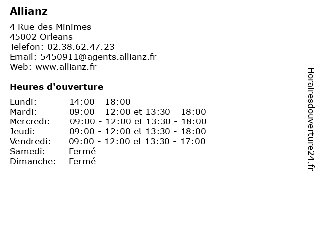 1 Allianz (Distance: 0,15 km) 3 Rue de la Lionne, 45002 Orléans allianz, assurance prêt, assurances, services 2 Allianz (Distance: 0,67 km) 32 Rue Albert 1er, 45000 Orleans allianz, assurance prêt, assurances, services 3 Allianz (Distance: 2,63 km) 6 Place Olivier De Serre, 45100 Orleans allianz, assurance prêt, assurances, services 4 Allianz (Distance: 3,53 km) 400 rue du Faubourg Bannier, 45400 Fleury les Aubray agence, allianz, assurances 6 |