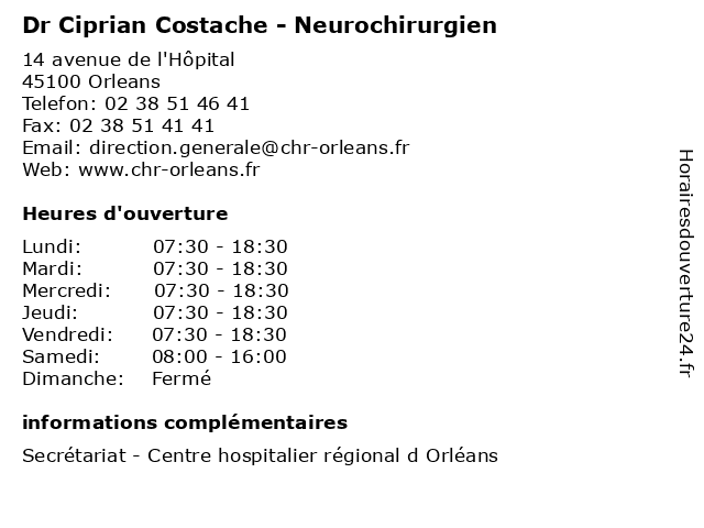 1 Dr Didier Dorwling-Carter - Neurochirurgien (Distance: 0,00 km) 14 avenue de l'Hôpital, 45100 Orleans carter, consultation, didier, docteur, dorwling, dr, med, médecin, neurochirurgien, traitement 2 Dr Andreea Costache - Médecin généraliste (Distance: 50,01 km) 8 Boulevard de la République, 18410 Argent-sur-Sauldre andreea, consultation, costache, docteur, dr, générale, généraliste, libre, medecins, médecin, médecine, santé |