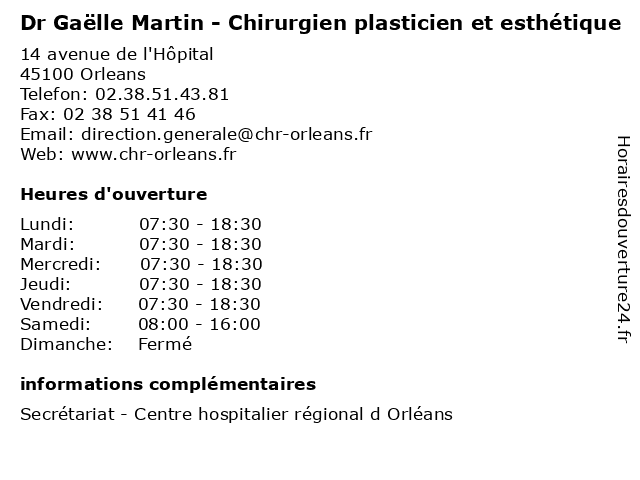 1 Dr Anne Danton - Chirurgien esthétique (Distance: 2,58 km) 83 Rue Jacques Monod, 45160 Olivet anne, chirurgie, chirurgien, danton, dr, esthétique, general, soins 2 Dr Angel Jose Mateo Martin - Chirurgien-dentiste (Distance: 7,40 km) 24 Place du Général de Gaulle, 45000 Orléans angel, chirurgien, dentaire, dentiste, dr, implantologie, jose, martin, mateo, parodontologie 3 Medecin Jean Gabriel Martin (Échographiste) (Distance: 7,77 km) 17 Rue des Huguenots, 45000 Orleans docteur, gabriel, jean, martin, medecin, sante, services, échographiste 4 Logis Hôtel Saint-Martin (Distance: 7,84 km) 52 Boulevard Alexandre Martin., 45000 Orléans bar, citotel, hotel, hôtel, logis, martin, restaurant, réunions, saint, évenements 5 Brocante Alexandre Martin à Orléans (Distance: 8,32 km) . Esplanade du Souvenir Français, 45000 Orléans alexandre, brocante, frutas, hortalizas, martin, mercado, orléans, verduras 6 |