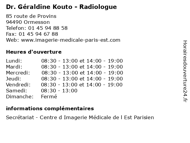 1 Dr Géraldine Kouto - Radiologue - secrétariat (Distance: 5,05 km) 16 Place de la Louvière, 94100 Saint-Maur-des-Fossés consultation, docteur, dr, géraldine, kouto, med, médecin, médecine, radiologue, secrétariat, traitement 2 Dr Géraldine Jabot - Radiologue (Distance: 5,09 km) 33 Rue Léon Menu, 94360 Bry-sur-Marne centre, d'imagerie, de, diagnostique, dr, géraldine, hôpital, imagerie, imef, jabot, la, marne, médicale, privé, radiologie, radiologue, thérapeutique, vallée 3 Dr Géraldine Jabot - Radiologue (Distance: 7,34 km) 3 Avenue Watteau, 94130 Nogent-sur-Marne armand, brillard, centre, d'imagerie, diagnostique, dr, géraldine, hpab, hôpital, imagerie, imef, jabot, médicale, privé, radiologie, radiologue, thérapeutique 4 Dr Géraldine Jabot - Radiologue (Distance: 7,49 km) 10 Rue de l'Orangerie, 94170 Le Perreux-sur-Marne centre, d'imagerie, de, diagnostique, dr, géraldine, imagerie, imef, jabot, l'orangerie, médicale, radiologie, radiologue, thérapeutique 5 Dr Géraldine Kouto - Radiologue-secretariat (Distance: 8,10 km) 16 Avenue Louison Bobet, 94120 Fontenay-sous-Bois dr, géraldine, kouto, médecin, médecine, médical, pharmaceutique, radiologue, secretariat, traitement 6 Géraldine Coquelet - Ostéopathe - secretariat (Distance: 8,55 km) 14 Place Moreau David, 94120 Fontenay-sous-Bois coquelet, géraldine, médecin, médecine, médical, ostéopathe, pharmaceutique, secretariat, traitement |