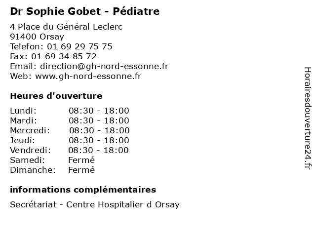 1 Dr Sophie Cassier - Chirurgien plasticien et esthétique (Distance: 0,00 km) 4 Place du Général Leclerc, 91400 Orsay cassier, chirurgien, consultation, docteur, dr, esthétique, et, med, médecin, plasticien, sophie, traitement 2 Dr Marilyn Fuger - Pédiatre (Distance: 1,81 km) 12 bis Rue du Général Leclerc, 91440 Bures-sur-Yvette bebe, dr, fuger, marilyn, nourisson, pédiatre, pédiatrie 3 Anne Sophie Destombes - Sage-femme (Distance: 2,06 km) 3 Rue du Maine, 91940 Les Ulis anne, destombes, femme, médecin, médecine, médical, pharmaceutique, sage, sophie, traitement 4 Lemonnier Sophie (Distance: 2,91 km) 3 Place Gérard Nevers, 91140 Villebon-sur-Yvette lemonnier, sophie 5 Dr Claire Bretagne - Pédiatre (Distance: 3,15 km) 92 Avenue du Général Leclerc, 91120 Palaiseau bebe, bretagne, claire, dr, nourisson, pédiatre, pédiatrie 6 Boulangerie-Pâtisserie Sophie Lebreuilly (Distance: 3,95 km) 7 route de Bièvres, 91400 Saclay boulangerie, boulangeries, cafe, lebreuilly, patisseries, pâtisserie, salades, sophie, viennoiseries |