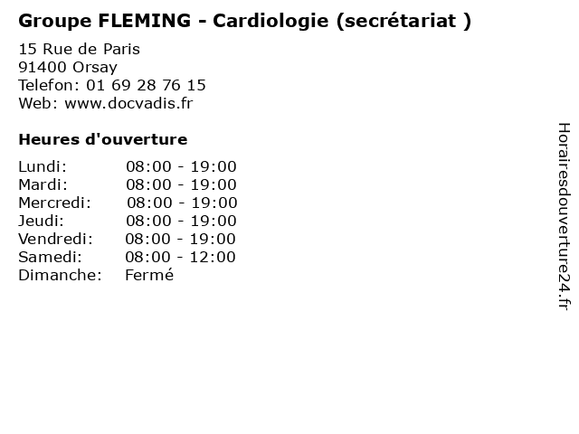1 Université Résidence Les jardins de Fleming (Distance: 0,09 km) 21 rue André Maginot, 91400 Orsay de, fleming, hébergement, jardins, les, résidence, universitaire, université 2 Groupe Hospitalier Nord Essonne - Site Orsay (Distance: 0,21 km) 4 Place du Général Leclerc, 91400 Orsay essonne, groupe, hospitalier, nord, orsay, site 3 Groupe Hospitalier Nord Essonne - Site Orsay (Distance: 0,21 km) 4 pl Gén Leclerc, 91400 Orsay essonne, groupe, hospitalier, nord, orsay, site 4 Groupe Hospitalier Nord Essonne - Site Orsay (Distance: 0,21 km) 4 Place du Général Leclerc, 91400 Orsay essonne, groupe, hospitalier, nord, orsay, site 5 CH D'Orsay - Cardiologie (secrétariat ) (Distance: 0,22 km) 4 Place du Général Leclerc, 91401 Orsay cardiologie, ch, consultation, d'orsay, docteur, santé, secrétariat 6 Groupe Hospitalier Nord-Essonne site Orsay (Distance: 0,22 km) 4 Place du Général Leclerc, 91400 Orsay essonne, groupe, hospitalier, nord, orsay, site |