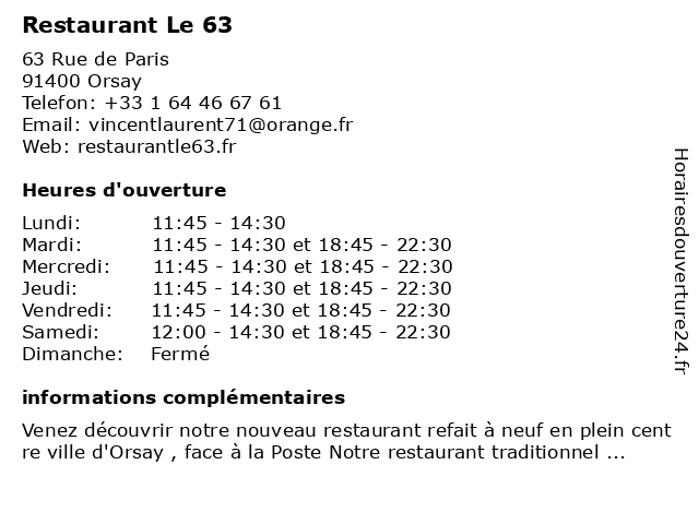 1 Restaurant Le 63 (Distance: 0,01 km) 63 Rue De Paris, 91400 Orsay 63, bar, brasserie, café, le, restaurant, restauration 2 Yespark, location de parking au mois - Victor Hugo - 63 rue des Belles Feuilles - Paris 16 (Distance: 20,19 km) 61-63 Rue des Belles Feuilles, 75016 Paris 16, 63, au, belles, de, des, feuilles, hugo, location, mois, paris, parking, rue, victor, yespark 3 4 Les Créateurs d'Opta Le 63 Paris (Distance: 23,49 km) 63 Rue des Abbesses, 75018 Paris 63, créateurs, d'opta, le, les, paris 5 Istanbul 63 (Distance: 33,99 km) 2 Rue Auguste Romagne, 78700 Conflans Sainte Honorine 63, istanbul, restaurants |