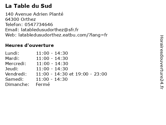 | Vendredi | 11:00-14:30 et 19:00-23:00 |