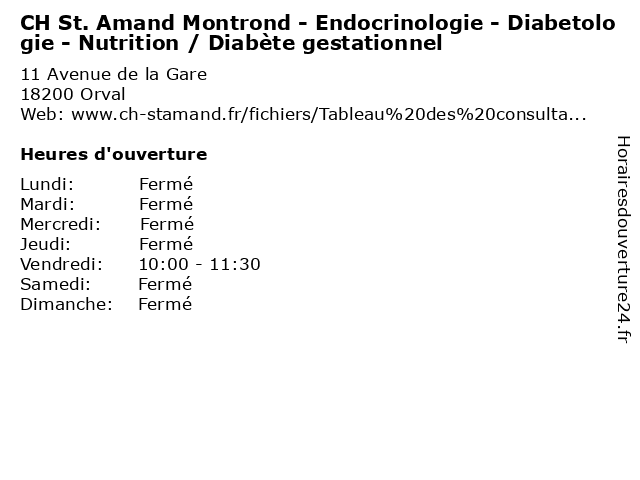 1 CH St. Amand Montrond - Endocrinologie - Diabetologie - Nutrition / Diabète gestationnel (Distance: 0,66 km) 44 Avenue Jean Jaurès, 18200 Saint Amand Montrond amand, bureau, ch, consultation, diabetologie, diabète, dr, endocrinologie, gestationnel, maladie, med, montrond, médecin, médecine, nutrition, pratique, st., thérapie, traitement 2 CH St. Amand Montrond - Endocrinologie - Diabetologie - Nutrition / Diabète gestationnel (Distance: 1,51 km) - Place de la République, 18200 Saint Amand Montrond amand, bureau, ch, consultation, diabetologie, diabète, dr, endocrinologie, gestationnel, maladie, med, montrond, médecin, médecine, nutrition, pratique, st., thérapie, traitement 3 CH St. Amand Montrond - Endocrinologie - Diabetologie - Nutrition / Diabète gestationnel (Distance: 2,05 km) - Rue de la Croix Duchet, 18200 Saint Amand Montrond amand, bureau, ch, consultation, diabetologie, diabète, dr, endocrinologie, gestationnel, maladie, med, montrond, médecin, médecine, nutrition, pratique, st., thérapie, traitement 4 CH St. Amand Montrond - Endocrinologie - Diabetologie - Nutrition / Diabète gestationnel (Distance: 2,08 km) - Rue de La Fontaine Saint Martin, 18200 Saint Amand Montrond amand, bureau, ch, consultation, diabetologie, diabète, dr, endocrinologie, gestationnel, maladie, med, montrond, médecin, médecine, nutrition, pratique, st., thérapie, traitement 5 CH St. Amand Montrond - Cardiologie / Consultations (Distance: 0,00 km) 11 Avenue de la Gare, 18200 Orval amand, bureau, cardiologie, ch, consultation, consultations, dr, maladie, med, montrond, médecin, médecine, pratique, st., thérapie, traitement 6 CH St. Amand Montrond - Cardiologie / Echocardiographies (Distance: 0,00 km) 11 Avenue de la Gare, 18200 Orval amand, bureau, cardiologie, ch, consultation, dr, echocardiographies, maladie, med, montrond, médecin, médecine, pratique, st., thérapie, traitement |