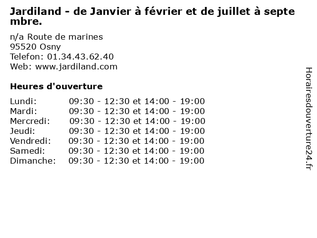 1 Jardiland - de Mars à juin et de octobre à décembre (Distance: 0,00 km) n/a Route de marines, 95520 Osny cosmetics, de, décembre, et, garden design, garden mineral, home decoration, jardiland, juin, mars, octobre, outdoors, scents, seed 2 Jardiland (Distance: 3,07 km) 1 chemin du Poirier Charles Guerin, 95520 Osny animalerie, jardiland, jardin 3 JARDILAND (Distance: 10,09 km) Rue Jean Jaurès, 78540 Vernouillet aménagement du jardin, animaux de compagnie, art de la table, barbecue cuisine d'extérieur, bassin, bougies et senteurs, décoration d'intérieur, entretien et soin des végétaux, equipement du jardinier, espace librairie, fleuristerie, jardiland, loisir plein air, luminaires, materiel et bricolage, mobilier de jardin, plantes d'intérieur, pots et contenants, semences et bulbes, végétaux d'extérieur 4 La Romainville (21 décembre au 03 janvier 2016) (Distance: 12,34 km) n/a Avenue Paul Raoul, 78130 Les Mureaux 03, 21, 2016, au, beverages, cakes, childen, cocktails, des, du, décembre, foams, fêtes, horaires, janvier, la, macarons, mochas, romainville 5 Château De Maison -- Du 2 Janvier Au 15 Mai (Distance: 15,07 km) 2 Avenue Carnot, 78600 Maisons-Laffitte 15, ancien, art, au, chateau, château, de, du, janvier, mai, maison, musee 6 JARDILAND (Distance: 16,29 km) D14, 78410 Flins-sur-Seine aménagement du jardin, animaux de compagnie, art de la table, barbecue cuisine d'extérieur, bassin, bougies et senteurs, décoration d'intérieur, entretien et soin des végétaux, equipement du jardinier, espace librairie, fleuristerie, jardiland, loisir plein air, materiel et bricolage, mobilier de jardin, plantes d'intérieur, pots et contenants, semences et bulbes, végétaux d'extérieur |