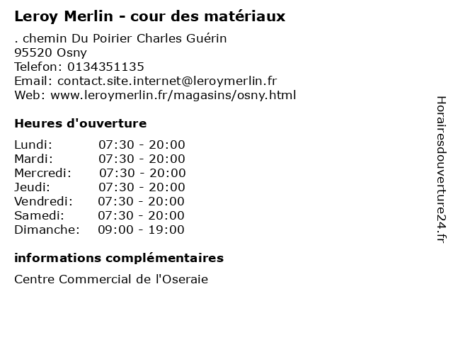 1 Leroy Merlin - cour des matériaux (Distance: 13,04 km) 45 Boulevard Victor Bordier, 95370 Montigny-les-Cormeilles cour, cuisine, decoration, des, leroy, matériaux, merlin, parquet, terrase jardin 2 Leroy Merlin - magasin (Distance: 0,00 km) . chemin Du Poirier Charles Guérin, 95520 Osny cuisine, decoration, leroy, magasin, merlin, parquet, terrase jardin 3 Castorama (cour matériaux) (Distance: 5,51 km) - Centre Commercial Art de Vivre, 95610 Eragny bricolage, castorama, cour, matériaux 4 Castorama (cour matériaux) (Distance: 9,53 km) 1 avenue du Général Leclerc, 95480 Pierrelaye bricolage, castorama, cour, matériaux 5 Leroy Merlin (Distance: 11,15 km) 5/7, Rue Louis Armand, 95200 Herblay accessories, decorators, glass, home, leroy, merlin, wood 6 Tout Faire Matériaux - Vallée de Seine matériaux (Distance: 12,98 km) 2 chemin de Medan, 78510 Triel sur Seine de, faire, location, matériaux, matériel, menuiserie, panneaux, sanitaire, seine, service, tout, vallée, vente, ventilation |