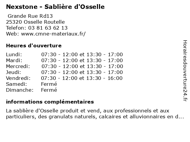 1 Nexstone - Carrière d'OSSELLE (Distance: 0,02 km) D13, 25320 Osselle-Routelle carrière, d'osselle, nexstone 2 Nexstone - Carrière de Chemaudin et Vaux / Valormat (Distance: 8,76 km) Route Départementale 216, 25320 Chemaudin-Et-Vaux carrière, chemaudin, de, et, fournisseur de matériaux pour le bâtiment, fournisseur de sable et gravier, nexstone, valormat, vaux 3 Nexstone - Carrière de CHEMAUDIN-ET-VAUX (Distance: 9,25 km) RD 216, 25320 Chemaudin et Vaux carrière, chemaudin, de, et, nexstone, vaux 4 Nexstone - Carrière d'Epeugney (Distance: 12,15 km) 102 Rte De Besançon, 25290 Épeugney carrière, d'epeugney, nexstone 5 Nexstone - Carrière de Boult / Valormat (Distance: 28,99 km) Route De Voray Rd33, 70190 Boult boult, carrière, de, fournisseur de matériaux pour le bâtiment, fournisseur de sable et gravier, nexstone, valormat 6 Nexstone - Carrière de Monnières (Distance: 29,12 km) Avenue Gustave Courbet Rd354, 39100 Monnieres carrière, de, fournisseur de matériaux pour le bâtiment, fournisseur de sable et gravier, monnières, nexstone |