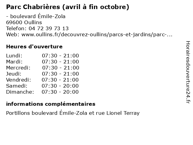 1 Parc naturel de l'Yzeron (D'avril à fin octobre ) (Distance: 0,00 km) - boulevard Émile-Zola, 69600 Oullins berges, d'avril, de, fin, jardins, l'yzeron, naturel, octobre, parc, parcs 2 Parc Chabrières (novembre à fin mars) (Distance: 0,00 km) - boulevard Émile-Zola, 69600 Oullins berges, chabrières, fin, jardins, mars, novembre, parc, parcs 3 Parc Chabrières (portail principal, avril à fin octobre) (Distance: 0,14 km) 44 Grande rue, 69600 Oullins avril, berges, chabrières, fin, jardins, octobre, parc, parcs, portail, principal 4 Parc Chabrières (portail principal, novembre à fin mars) (Distance: 0,14 km) 44 Grande rue, 69600 Oullins berges, chabrières, fin, jardins, mars, novembre, parc, parcs, portail, principal 5 Jardin de la Salamandre (D'avril à fin octobre) (Distance: 0,53 km) 60 rue du Buisset, 69600 Oullins berges, d'avril, de, fin, jardin, jardins, la, octobre, parcs, salamandre 6 Square Dubois-Crancé (d'avril à fin octobre) (Distance: 0,59 km) - Rue Dubois Crancé, 69600 Oullins berges, crancé, d'avril, dubois, fin, jardins, octobre, parcs, square |