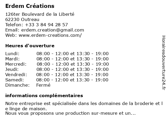 | Mercredi | 08:00-12:00 et 13:30-19:00 |