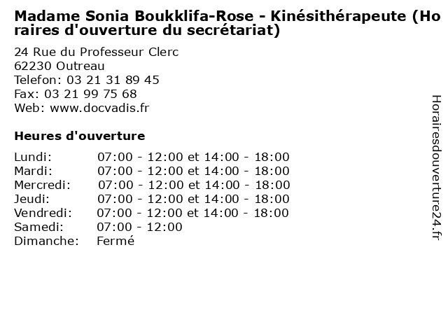 Termes de recherche pour Madame Sonia Boukklifa-Rose - Kinésithérapeute (Horaires d'ouverture du secrétariat):du, d'ouverture, horaires, santé, sonia, rose, madame, secretariat, docteur, médecins, consultation, kinésithérapeute, boukklifa |
