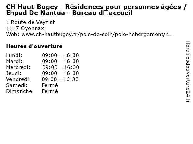 1 CH Haut-Bugey - Hôpital de jour – Ambulatoire (Distance: 0,00 km) 1 Route de Veyziat, 01117 Oyonnax ambulatoire, bugey, bureau, ch, consultation, de, dr, haut, hôpital, jour, maladie, med, médecin, médecine, pratique, thérapie, traitement 2 CH Haut-Bugey - Résidences pour personnes âgées / Ehpad D’Eyonnax - Bureau d’accueil (Distance: 0,00 km) 1 Route de Veyziat, 01117 Oyonnax bugey, bureau, ch, consultation, dr, d’accueil, d’eyonnax, ehpad, haut, maladie, med, médecin, médecine, personnes, pour, pratique, résidences, thérapie, traitement, âgées 3 CH Haut-Bugey - Service de Soins Infirmiers à Domicile (Distance: 0,00 km) 1 Route de Veyziat, 01117 Oyonnax bugey, bureau, ch, consultation, de, domicile, dr, haut, infirmiers, maladie, med, médecin, médecine, pratique, service, soins, thérapie, traitement 4 CH Haut-Bugey - Service social et PASS / Permanence médicale (PASS) (Distance: 0,00 km) 1 Route de Veyziat, 01117 Oyonnax bugey, bureau, ch, consultation, dr, et, haut, maladie, med, médecin, médecine, médicale, pass, permanence, pratique, service, social, thérapie, traitement 5 CH Haut-Bugey - Service social et PASS / Service social des malades (Distance: 0,00 km) 1 Route de Veyziat, 01117 Oyonnax bugey, bureau, ch, consultation, des, dr, et, haut, malades, maladie, med, médecin, médecine, pass, pratique, service, social, thérapie, traitement 6 CH Haut-Bugey - Laboratoire / Horaires d’ouverture au public (Distance: 0,00 km) 1 Route de Veyziat, 01117 Oyonnax au, bugey, bureau, ch, consultation, dr, d’ouverture, haut, horaires, laboratoire, maladie, med, médecin, médecine, pratique, public, thérapie, traitement |