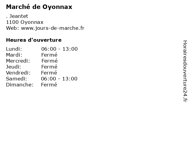 1 Marché de Oyonnax (Distance: 1,17 km) . Cours de Verdun, 01100 Oyonnax alimentaire, de, fleur, habillement, marché, oyonnax, services 2 Bistrot du marché Oyonnax (Distance: 0,69 km) 74 Rue Jules Michelet, 01100 Oyonnax bistrot, du, marché, oyonnax 3 Marché de Arbent (Distance: 7,58 km) . Rue de Ville, 01100 Arbent alimentaire, arbent, de, fleur, habillement, marché, services 4 Marché Aux Affaires (Distance: 12,49 km) 1 Rue du Docteur Grezel, 01130 Nantua affaires, aux, discount, décoration, habitat, literie, marché 5 Marché à Saint-Claud (Distance: 12,79 km) . Ville, 16450 Saint-Claud claud, frutas, hortalizas, marché, mercado, saint, verduras 6 Marché à Lavans-lès-Saint-Claude (Distance: 13,83 km) . Ville, 39170 Lavans-lès-Saint-Claude claude, frutas, hortalizas, lavans, lès, marché, mercado, saint, verduras |