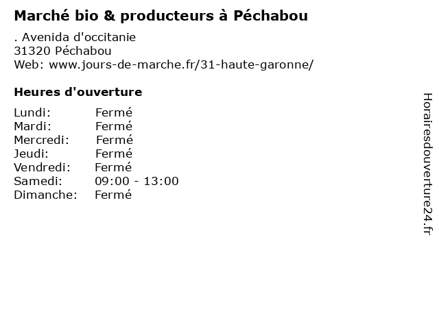 1 Marché à Péchabou (Distance: 0,10 km) . Merlet, 31320 Péchabou frutas, hortalizas, marché, mercado, péchabou, verduras 2 Marché biologique à Montbrun-Lauragais (Distance: 3,10 km) . Place Village, 31450 Montbrun-Lauragais biologique, frutas, hortalizas, lauragais, marché, mercado, montbrun, verduras 3 Marché biologique à Ramonville-Saint-Agne (Distance: 3,30 km) . Avenue d'Occitanie, 31520 Ramonville-Saint-Agre agne, biologique, frutas, hortalizas, marché, mercado, ramonville, saint, verduras 4 Marché des Halles biologique à Castanet-Tolosan (Distance: 3,41 km) . Ville, 31320 Castanet-Tolosan biologique, castanet, des, frutas, halles, hortalizas, marché, mercado, tolosan, verduras 5 Marché à Castanet-Tolosan (Distance: 3,41 km) . Ville, 31320 Castanet-Tolosan castanet, frutas, hortalizas, marché, mercado, tolosan, verduras 6 Marché à Merville (Distance: 3,41 km) . Ville, 31330 Merville frutas, hortalizas, marché, mercado, merville, verduras |