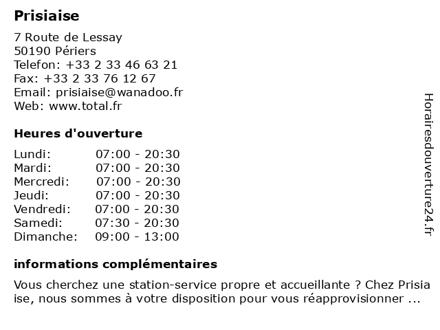 1 TotalEnergies - SARL PRISIAISE (Distance: 0,03 km) Route de Lessay, 50190 Périers gas station, prisiaise, sarl, station service, tankstelle, total, totalenergies 2 Pharmacie PRISIAISE (Distance: 0,50 km) 2 Place du Général Leclerc, 50190 Périers pharmacie, prisiaise |